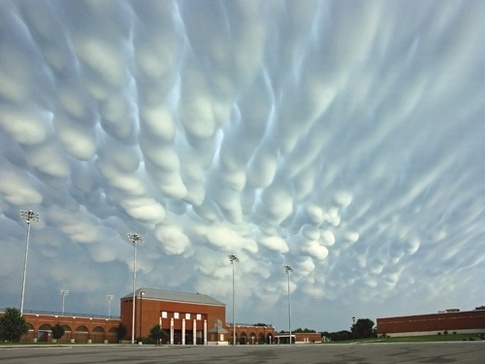是在积雨云下方形成的乳状型积云,是当下降气流当中温度较冷的空气与上升气流中温度较暖的空气相遇,就将形成像一个个袋子形状的乳状形云。