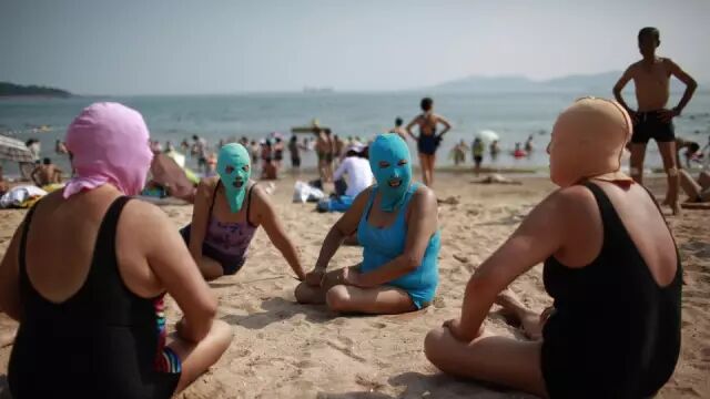 【上图的意思是说中国妇女去海滩,带上头套,至少脸不会被晒黑】
