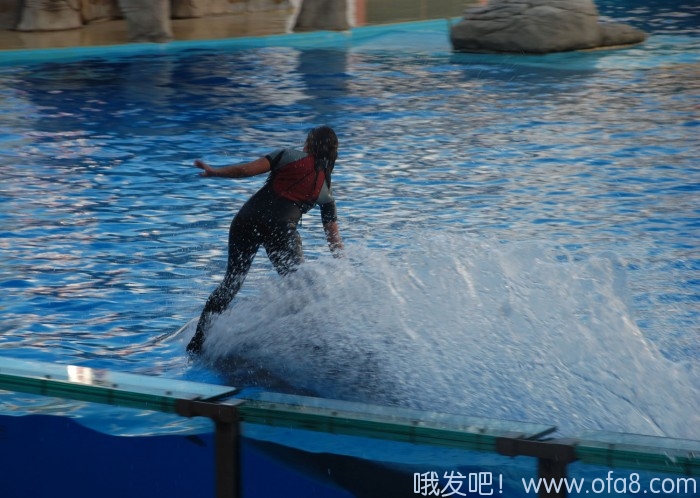 以下几张图片,个人以为是海豚表演中难度最大的一个节目。MM站在其中一条海豚的