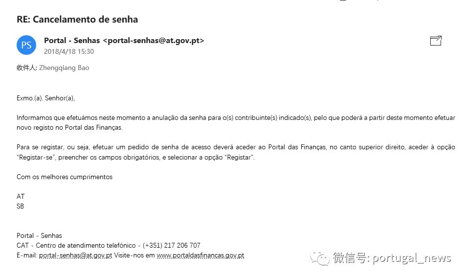 用在税务局登记过的电子信箱向portal-senhas@at.gov.pt地址发送一份邮件,邮件内容如下: